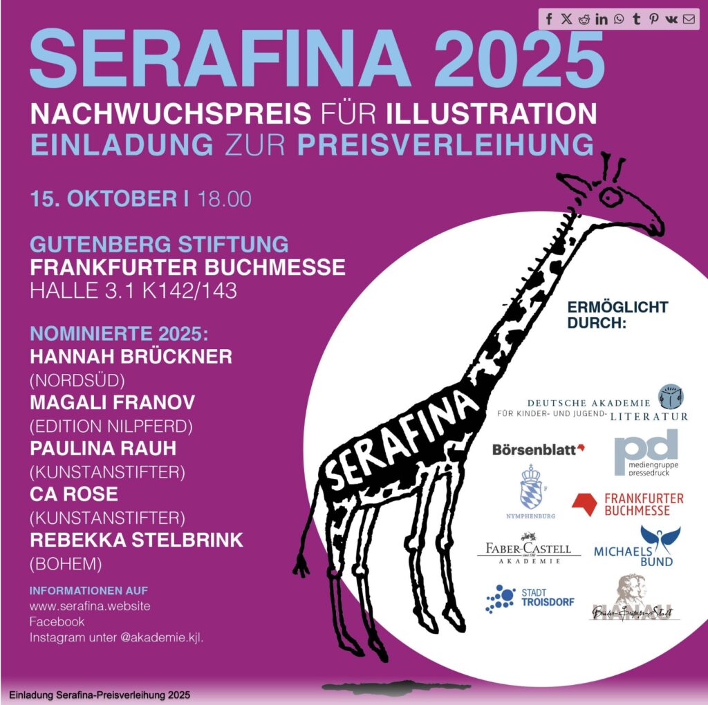 Herzliche Einladung zur Verleihung der Serafina 2025 am 15. Oktober 2025 auf der Frankfurter Buchmesse. Hanaus Bürgermeister Dr. Maximilian Bieri wird die Preisträgerin persönlich nach Hanau als ausstellende Illustratorin der Hanauer Kinder- und JugendBuchWochen einladen!